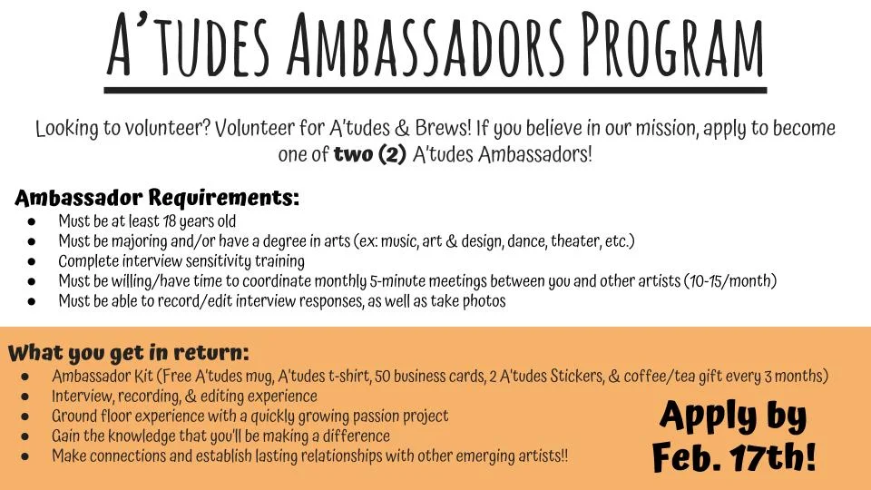 Volunteer for A’tudes & Brews! If you’re an artist who believes in our mission and wants to help push this project forward, apply to become one of two (2) A’tudes Ambassadors! Applications are open until February 17th, 2017